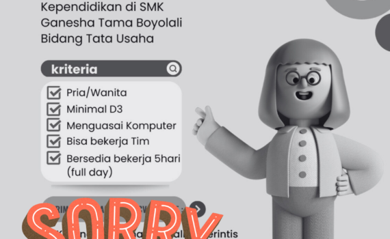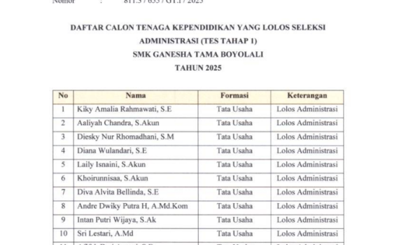 INFORMASI Penerimaan Peserta Didik Baru SMK Ganesha Tama Boyolali Tahun Ajaran 2025/2026 PENDAFTARAN.ONLINE| FACEBOOK | INSTAGRAM | YOUTUBE | TIKTOK | WHATSAPP Melalui kerjasama perusahaan dengan sekolah, penyaluran kerja peserta seleksi rekrutmen bulan lalu pada hari Jum’at, 22 November 2024 sudah di umumkan mengenai peserta yang lolos. Alhamdulillah sebanyak 9 anak alumni SMK Ganesha Tama Boyolali siap di berangkatkan menuju Jakarta. Selamat dan Sukses ya.. 🙂