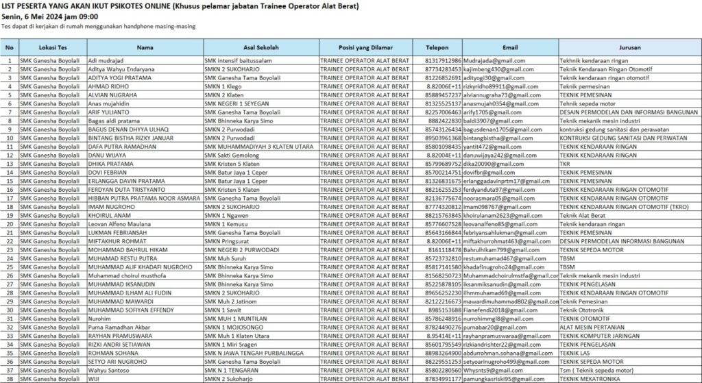 Berikut terlampir list nama peserta yg akan lanjut mengikuti assessment test online di hari Senin 6 mei 2024.