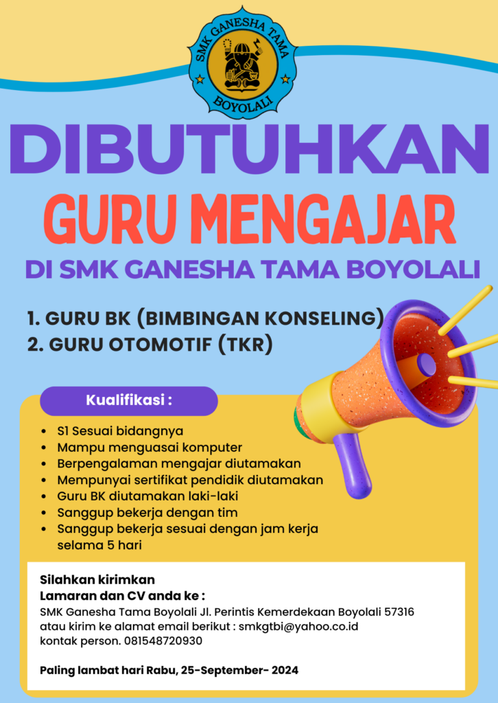 Lowongan Pekerjaan Guru Bimbingan Konseling dan Guru Otomotif