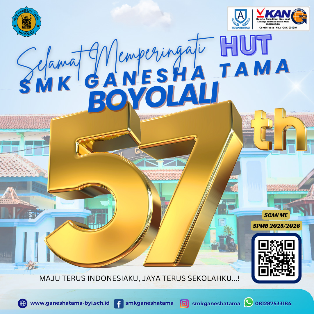 Selamat Ulang Tahun SMK Ganesha Tama Boyolali yang ke-57. Selamat untuk kita semua. Maju terus Indonesiaku, Jaya terus SMK Ganesha Tama.