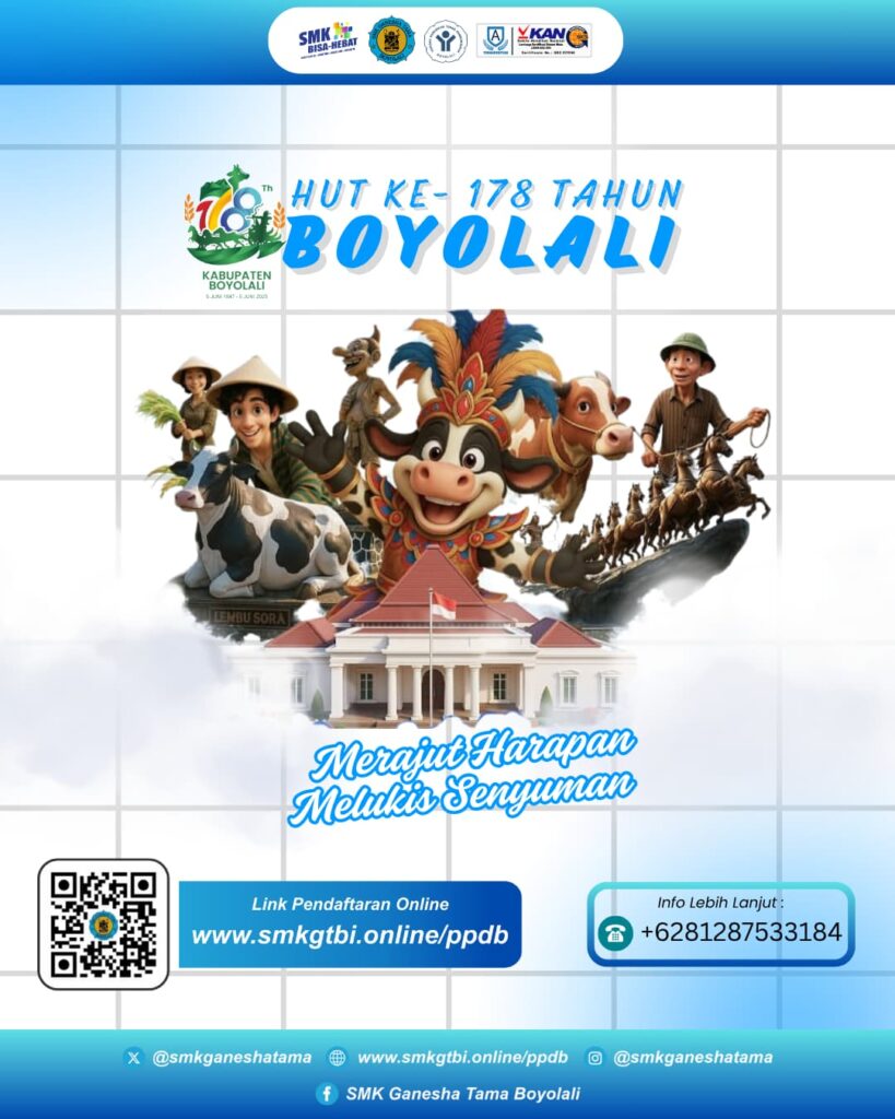 Dalam memperingati HUT BOYOLALI KE-17. Hari ini adalah momen bersejarah bagi kabupaten boyolali dimana usia yang sudah tidak muda, semoga boyolali menjadi kabupaten terdepan. Selamat HUT BOYOLALI KE-178, semoga Tuhan YME senantiasa memberikan keberkahan untuk kita semua. Aamiin.