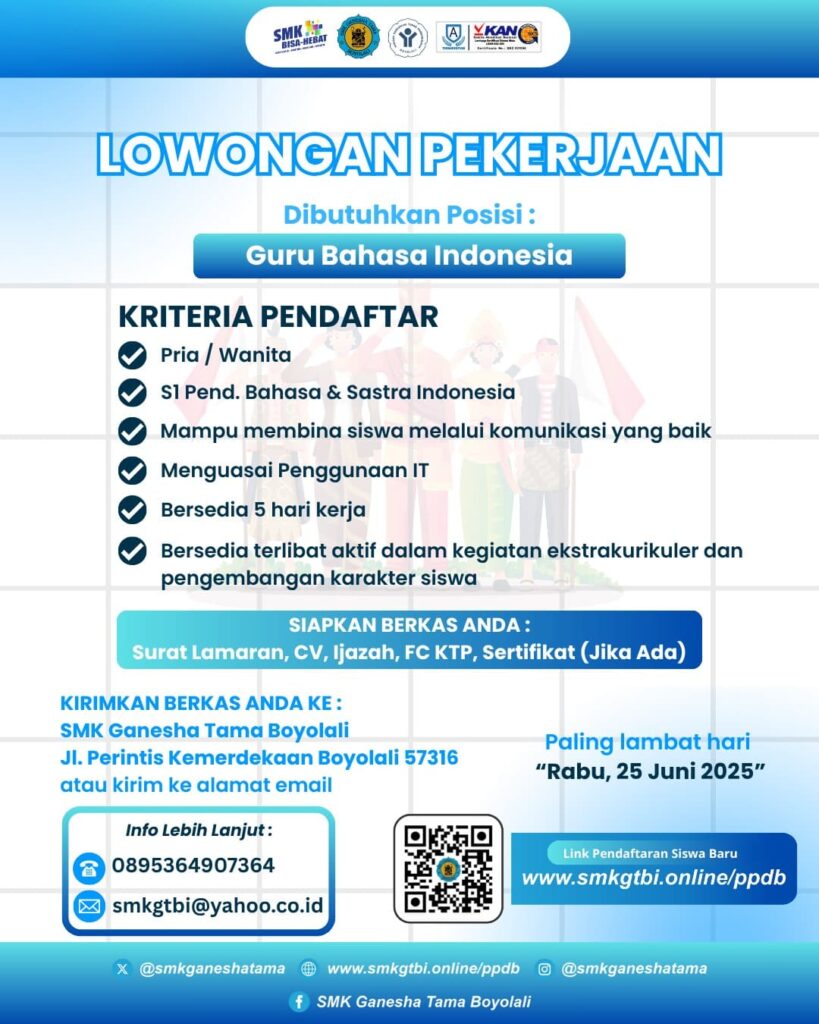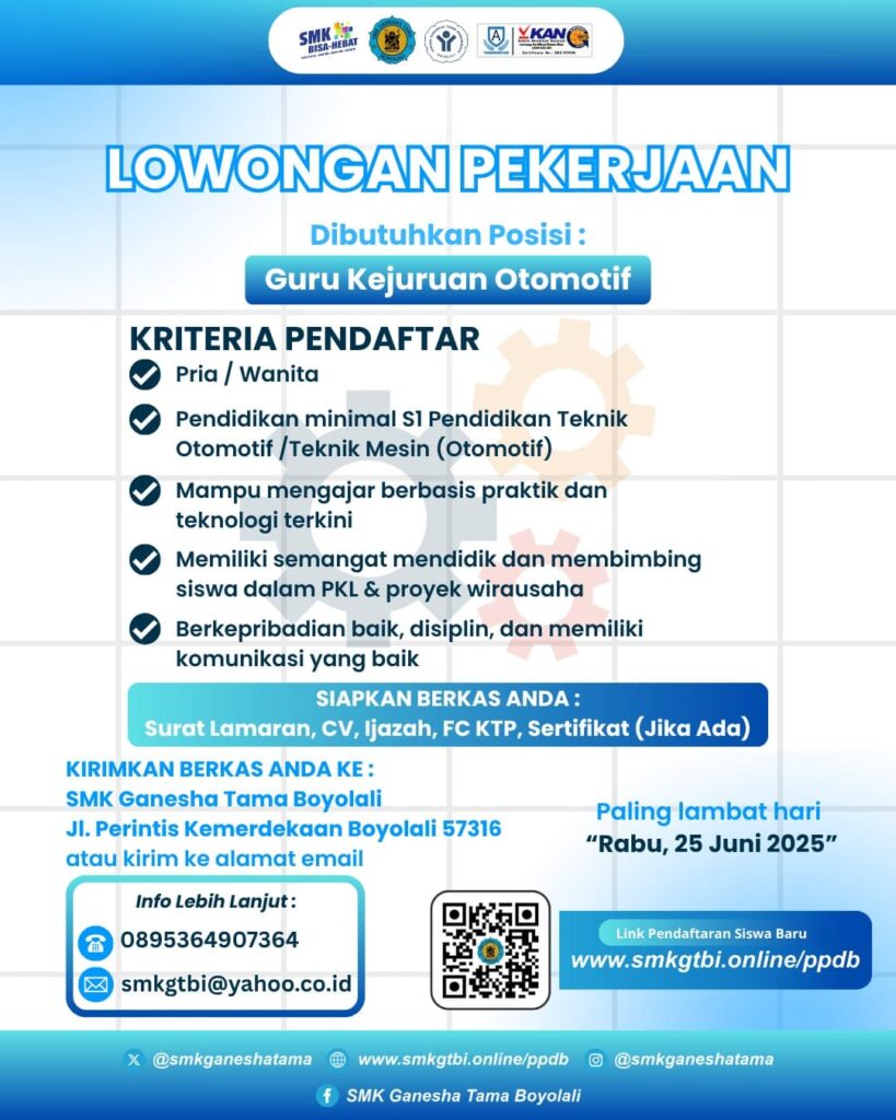 Lowongan Pekerjaan Tenaga Pendidik di SMK Ganesha Tama BoyolaliJuni 13, 2025 di Berita Pendidikan Oleh⣠Admin Lowongan pekerjaan sebagai tenaga pendidik di SMK Ganesha Tama Boyolali deng bidang program studi Guru Bahasa Indonesia Guru PPKN Guru Teknik Otomotif untuk informasi lebih lengkap dapat di lihat pada Gambar di bawah: