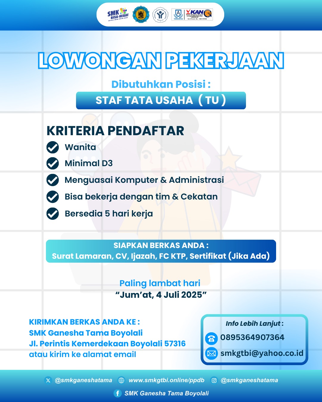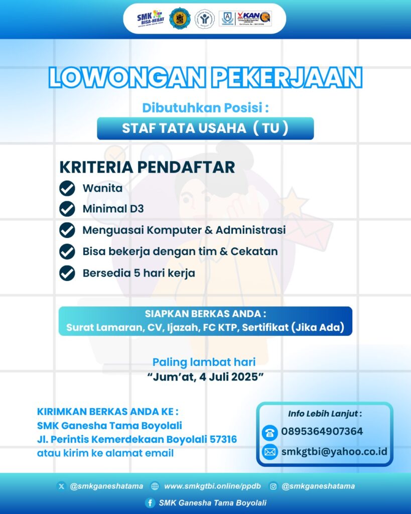 Lowongan Pekerjaan Staf Tata Usaha di SMK Ganesha Tama BoyolaliJuli 1, 2025 di Berita Pendidikan Oleh⣠Admin