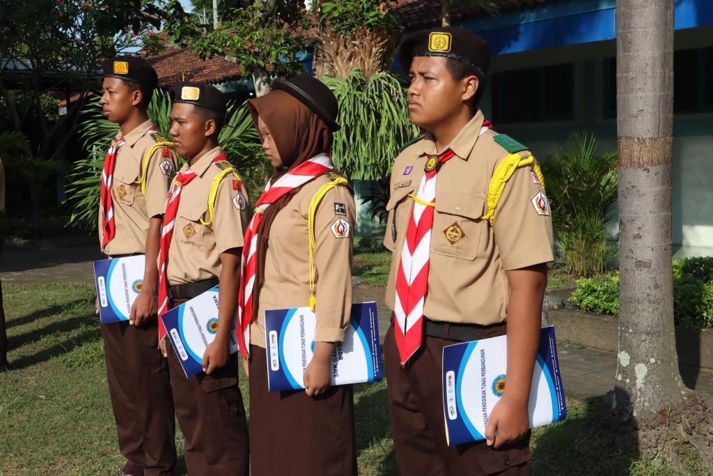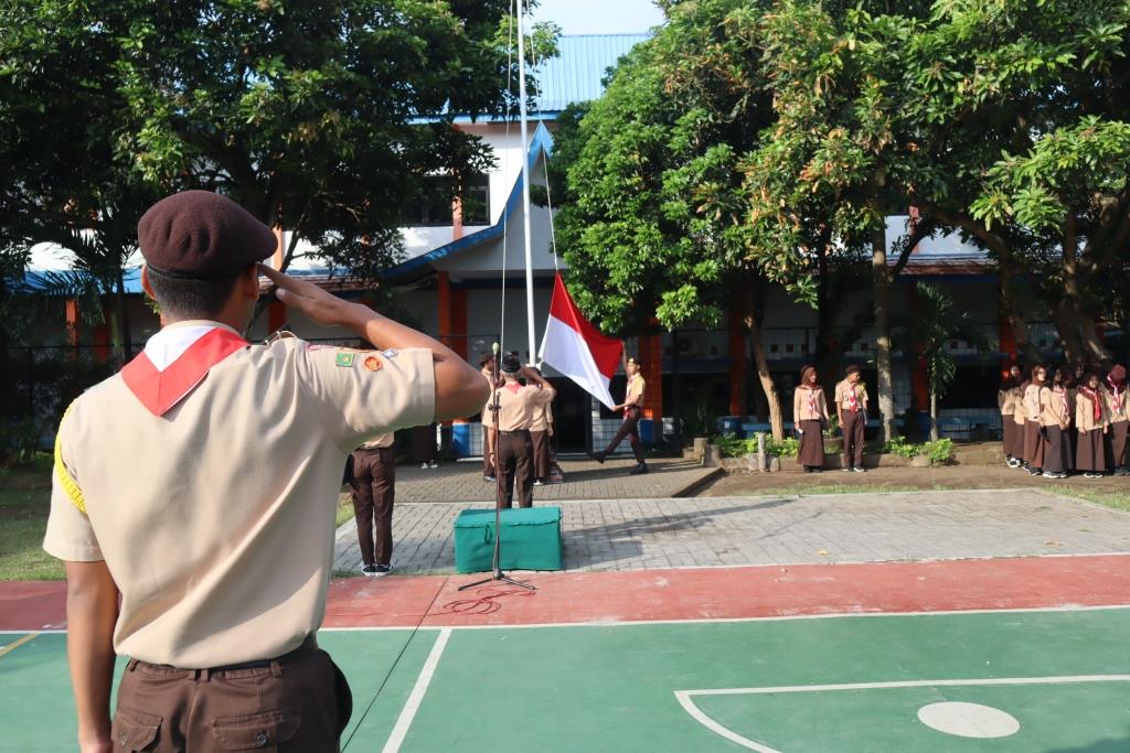 Dalam rangka memperingati Hari Pramuka Nasional ke-64, seluruh siswa melaksanakan upacara bendera di halaman sekolah bersama-sama. Sebagai Pramuka Indonesia, mereka adalah manusia Pancasila yang memiliki jiwa patriotisme kuat, melaksanakan upacara dengan khidmat.