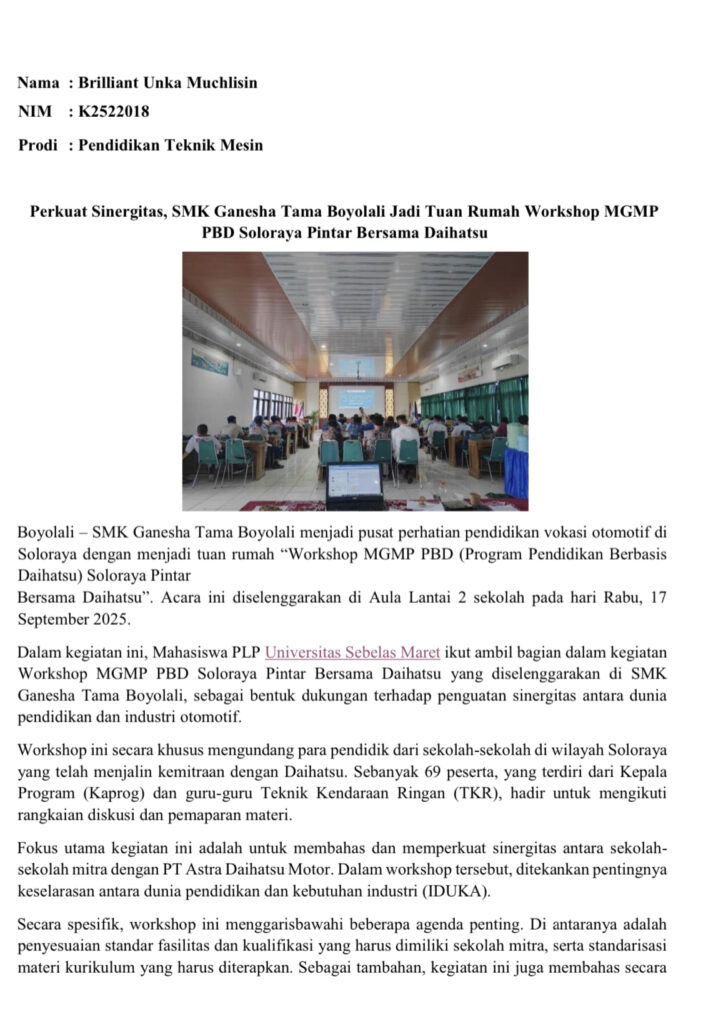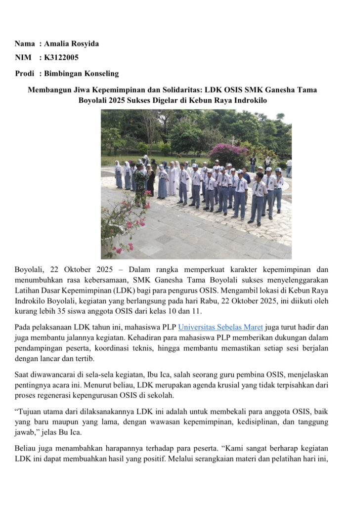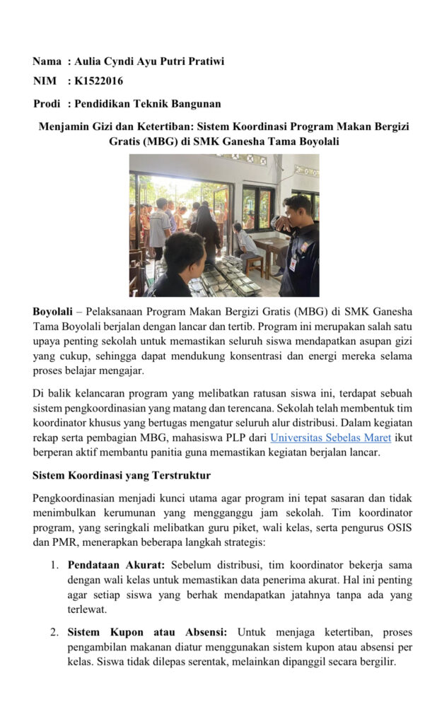 Mahasiswa Program Latihan Profesi (PLP) Universitas Sebelas Maret Surakarta dalam memenuhi tugas sebagai syarat laporan program belajar, mereka telah melakukan beberapa kegiatan sebagai bagian dari program PLP. Kegiatan ini bertujuan untuk meningkatkan kemampuan dan keterampilan mahasiswa sebagai calon guru, serta memberikan kontribusi bagi sekolah.