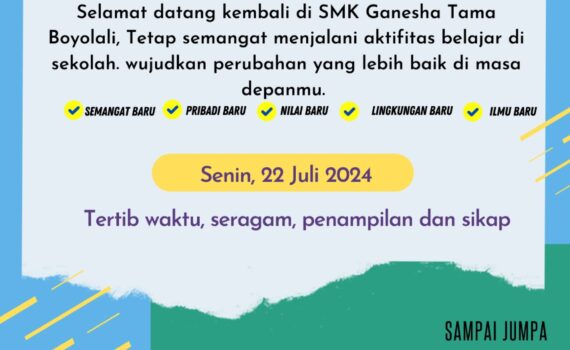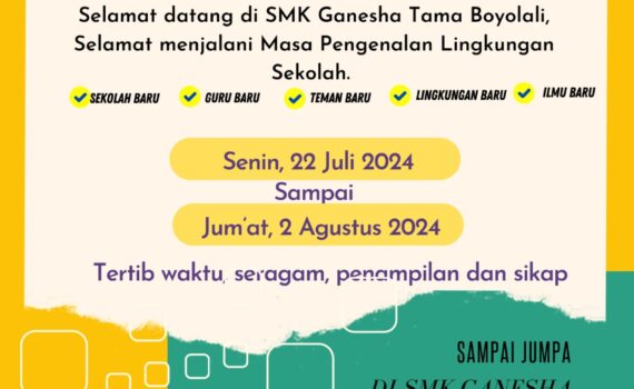 Jum’at, 19 Juli 2024 Masa Pengenalan Lingkungan Sekolah (MPLS) merupakan kegiatan dimana siswa mengenal sekolah di SMK Ganesha Tama Boyolali, mengenal program pembelajaran, tata tertib dan lingkungan belajar di sekitar sekolah. Kegiatan tersebut meliputi pengenalan profil sekolah, program pembelajaran sampai kegiatan sekolah hingga di luar sekolah (Ekstra) yang akan disampaikan oleh Bapak/Ibu Guru pembimbing. Dengan itu kegiatan MPLS bertujuan untuk menumbuhkan pengetahuan secara umum lingkungan sekolah dan adaptasi dimana Peserta Didik dapat menyesuaikan dengan lingkungan sekolah yang baru, guru baru dan teman yang baru juga. Pra MPLS Siswa Baru di SMK Ganesha Tama Boyolali. kegiatan yang dilaksanakan pagi hari ini […]